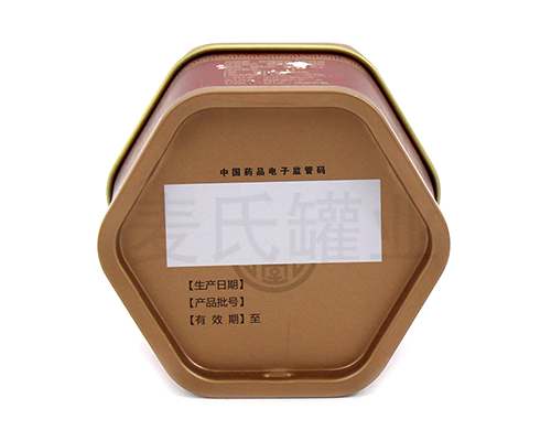 此款六角中藥丸馬口鐵盒子為單面CMYK四色印刷處理,外過(guò)水性亮光油,內(nèi)涂金油,過(guò)油目的不僅能提高鐵盒整體效果,具有強(qiáng)烈的金屬質(zhì)感外,還對(duì)鐵盒印刷面形成一層致密的保護(hù)膜,對(duì)鐵盒刮花、防銹起到一定的防護(hù)作用。除了過(guò)光油、金油外,客戶還可選擇過(guò)爆炸油、皺紋油、珠光油等,具體可咨詢:186-7632-2818.