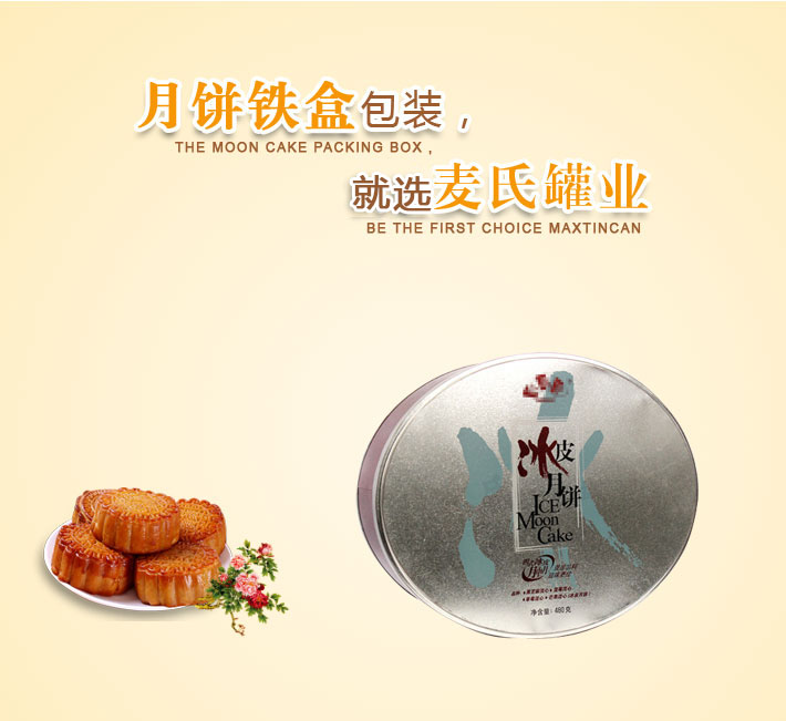 此款橢圓形中秋月餅鐵盒產品在印刷工藝方面,使用了四色與專色印刷工藝制作,內外表面處理為過光油。鐵盒作有透鐵效果處理,使得鐵盒整體具有的金屬質感。